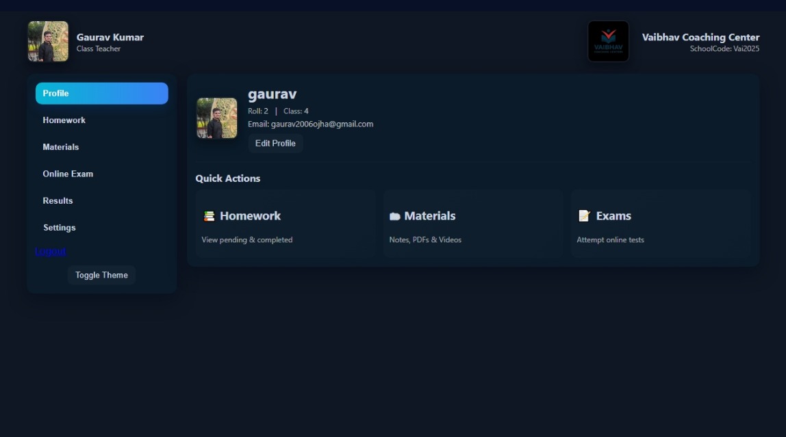Profiles, homework, results, and notifications in one place.